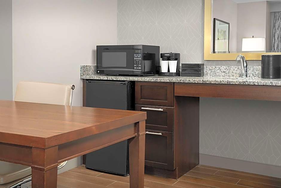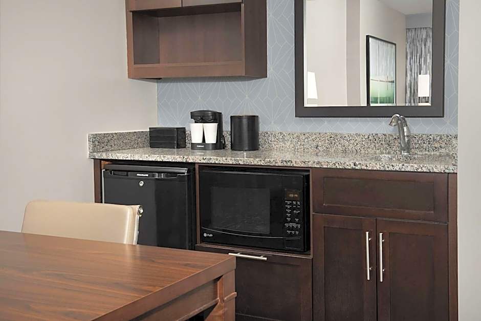 This hearing accessible premium suite features one king-sized bed. The room also has a visual alarm and notification devices for the doorbell or door knock and incoming telephone calls. Enjoy all of the comforts of home with this spacious suite with a king bed and private living room enhanced with a full kitchen including a full-sized refrigerator, two-burner stovetop and convection microwave. Perfect for extended stay or hospitality, each suite also includes a full-sized sofa bed, a 40-inch HDTV in both the bedroom and private living area, an in-room safe, wired and wireless internet access and a well-lit workspace. The bathrooms feature a marble vanity and hairdryer. A complimentary cooked-to-order breakfast and Evening Reception daily in our beautiful contemporary atrium area. Any corresponding photo may not reflect the specific accessible room type or room feature.